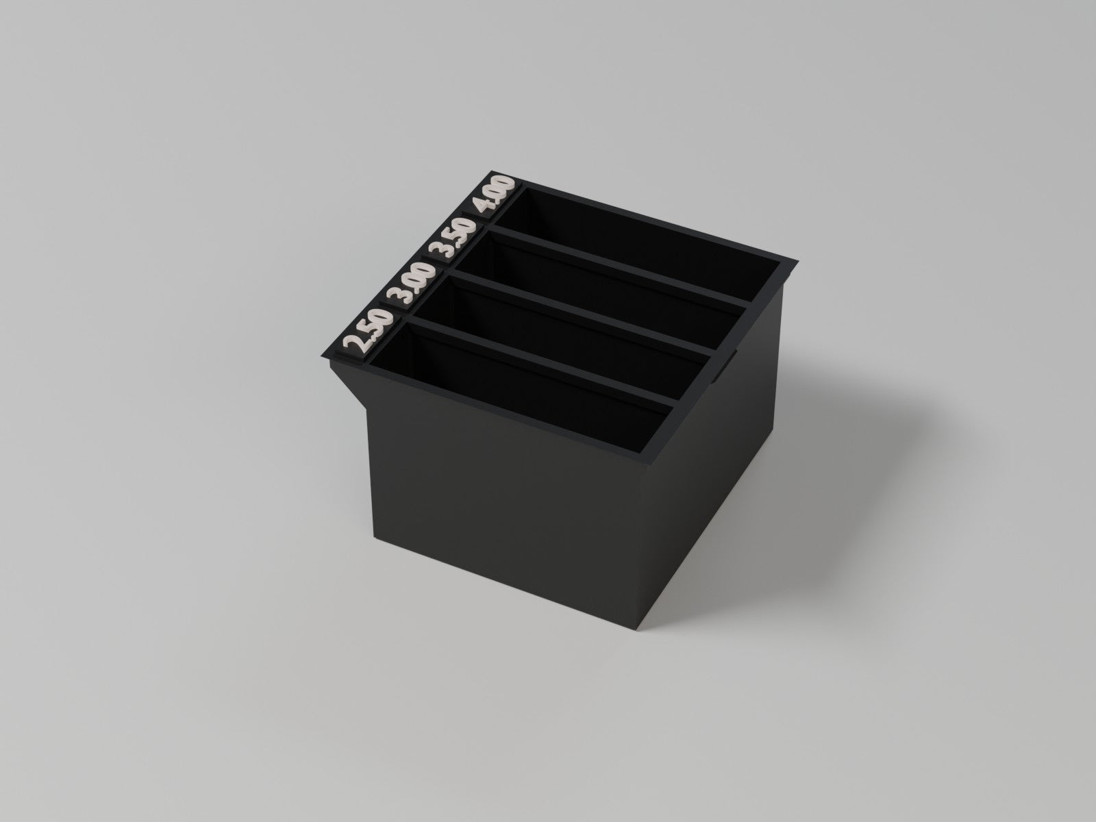 Dette innlegget deler en MonkeyBox inn i fire seksjoner, hvor hver seksjon har en egen merkeplate for tydelig merking av pinnestørrelse. Du velger selv teksten på hver merkeplate, slik at innlegget kan tilpasses akkurat ditt strikkeutstyr.